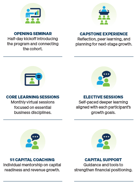 Get the strategy, insights, tools, and connections to scale your business. Inner City Capital Connections (ICCC) is a national business accelerator designed for growth-stage entrepreneurs ready to strengthen their companies and scale to the next level. ICCC combines executive education, peer learning, coaching, and capital readiness support to help business owners build stronger operations, make smarter decisions, and unlock new opportunities. Participation is fully funded for qualifying businesses, thanks to the generosity of ICIC’s national network of funding partners.